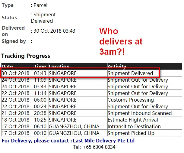 Meanwhile, we learnt from Last Mile Delivery Pte Ltd that Infinity Freight Solutions Pte Ltd’s system was down, so the latter marked all parcels as “delivered” regardless of delivery status. Apparently, there was someone else with the same problem of non-receipt of items. In short, this whole problem arose because Infinity Freight Solutions Pte Ltd lost all ability to track items, and the driver either lost the parcel or took it with him.