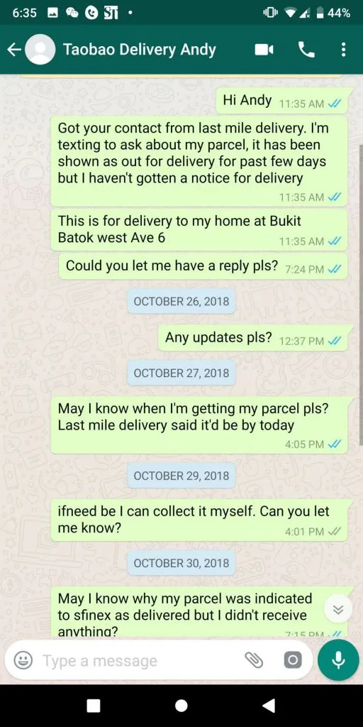 This was ridiculous. We called Andy, he still didn’t pick up. It was definitely the correct number. We called Last Mile Delivery Pte Ltd, they said that was atrocious by Andy and conveyed to Andy that there was a problem with my parcel.